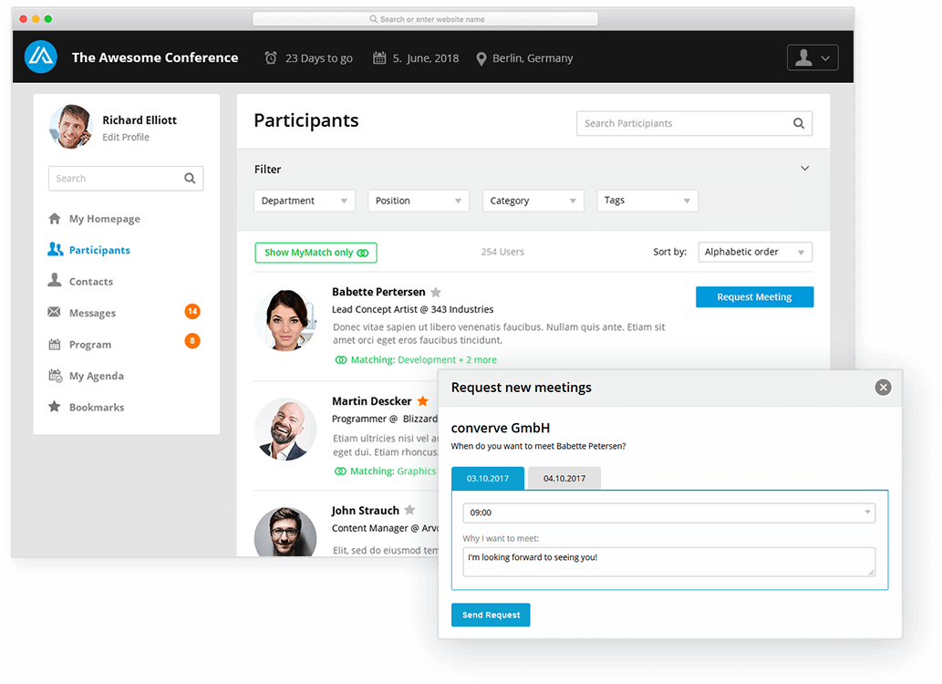 Our matchmaking algorithm will provide suggestions of potential meeting partners for you. You also can use search features to filter exactly the type of participants you are looking for. Save potential matches to your favorites list. Request appointments and react to incoming requests.